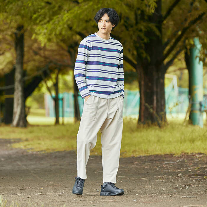 ウェイビングベルトが付いているのでサイズアップをして少しダボッと履いてみるのもおすすめです。ヒップ周りにゆとりのあるサイズを選ぶと、女性らしさのある可愛らしいシルエットを楽しめるアイテムになっています。全体的に締め付けのないズボンになっているので狭い車内でも動きやすいでしょう。