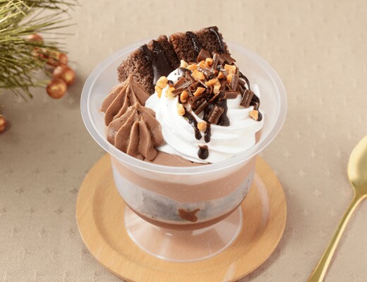 「チョコムース、ホイップクリーム、チョコスポンジ、アーモンド、チョコをトッピングしたチョコレートパフェ。」