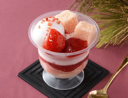「いちご風味のスポンジ、いちごソース、苺、ストロベリーピースを盛り付けたストロベリーパフェ。」