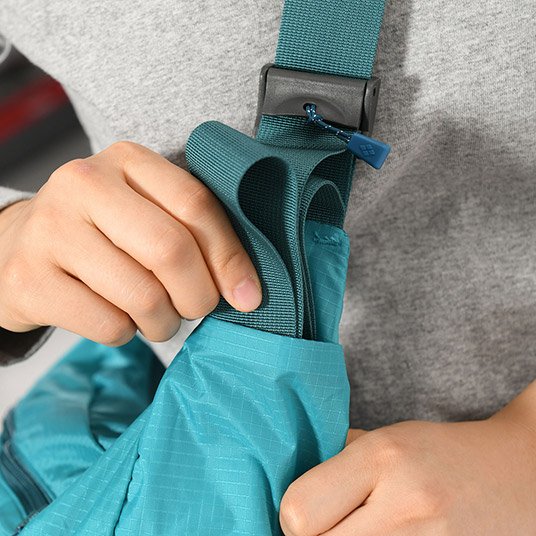 右サイドにはメッシュポケットがついており、小物を入れることができます。ショルダー部分の長さ調節も簡単に行え、余ったテープを収納できるポケット付き。