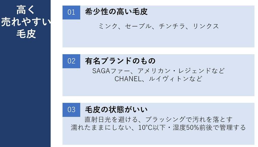 毛皮といっても全ての製品が高く売れるわけではありません。高く売れやすい毛皮の特徴をまとめました。