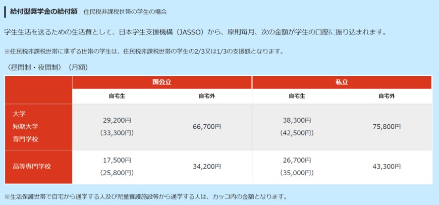 例えば、私立大学に自宅外から通う場合は、月額7万5800円もの給付金をもらうことが可能です。月額7万5800円もらえれば、生活はかなり楽になるでしょう。