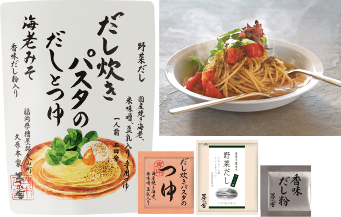 「だし炊きパスタのだしとつゆ 海老みそ」は、茅乃舎の「野菜だし」でパスタを炊くことで、野菜のうまみを麺に染み込ませて作る一品。