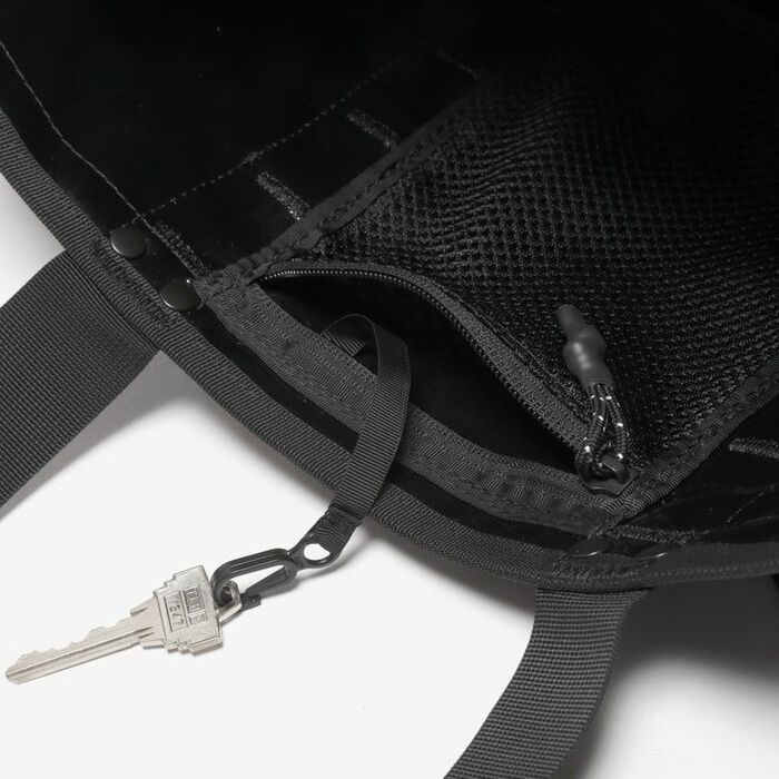 側面にもポケットがついていて小分け収納しやすいトートバッグです。耐水性と摩擦強度に優れたポリエステルが素材に使用されています。長さを調節できるショルダーストラップがついていて2WAY仕様です。小物を連結できるデイジーチェーンもあり、使い方の幅が広がりますよ。