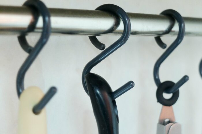 わが家のキッチン用品は、引っかける部分の形状がアイテムごとに異なっており、S字フックの種類によっては、うまくかけられないことがありました。