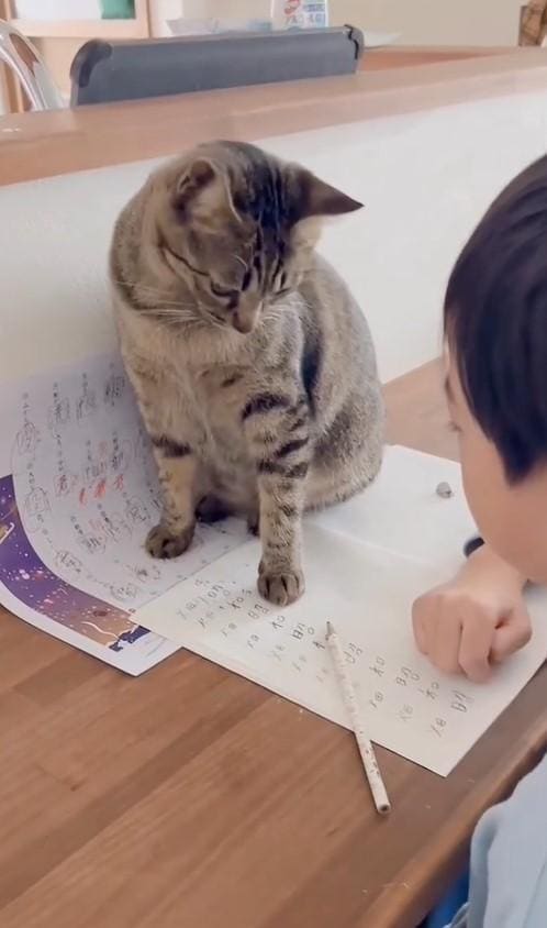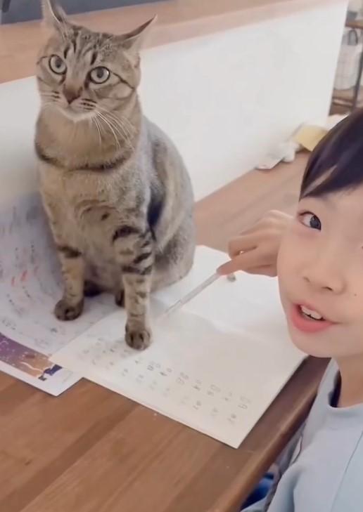 お兄ちゃんの漢字練習を断固として阻止する猫ちゃん。優しいお兄ちゃんとのほほえましい光景がInstagramで注目を集めています。
