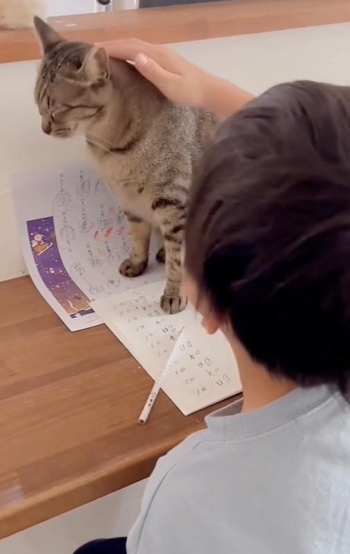 そこには「漢字練習」をするお兄ちゃんの姿がありますが、紙の上には一匹の猫ちゃんがモッフリと座り込んでいます。