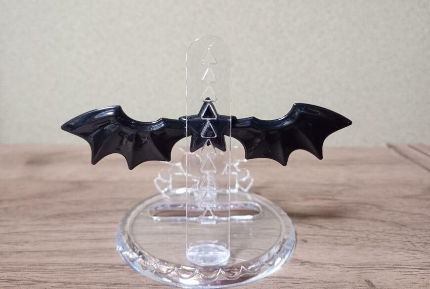 ぬいぐるみ用スタンド「ぬいぐるみデコスタンド 天使と悪魔」を実際に使ってみました。写真のぬいぐるみのサイズは12cmです。10cm前後のぬいぐるみのスタンドとして便利に活用できそうなサイズです。