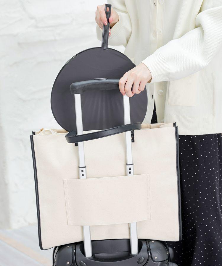 すっきりとしたスクエアフォルムが素敵なアイテムです。キャリーのハンドルを通せる仕様なので、安定感があり持ち運びにも便利です。