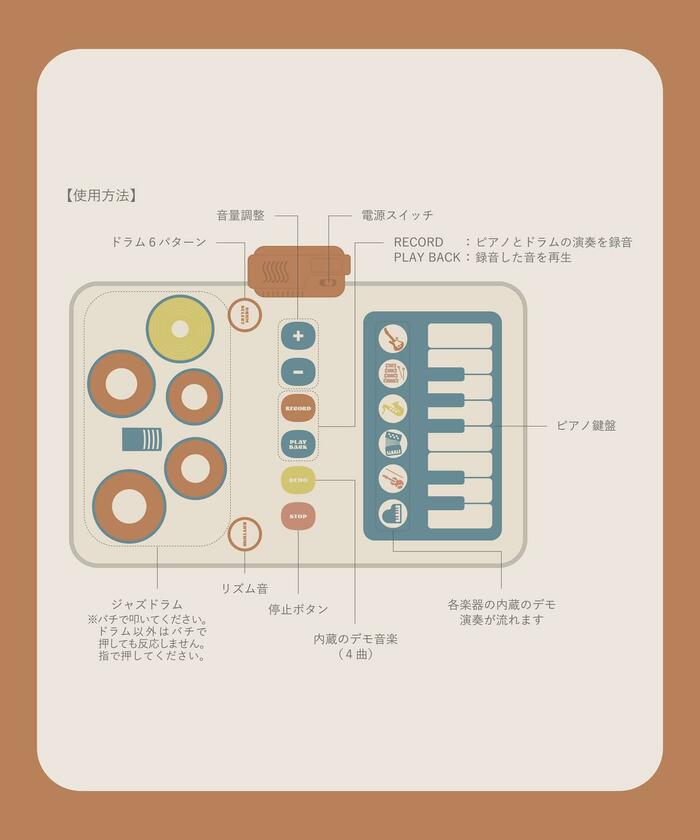ピアノ遊びとドラム遊びを楽しむことができます。使わないときは、折りたたんでコンパクトにできます。