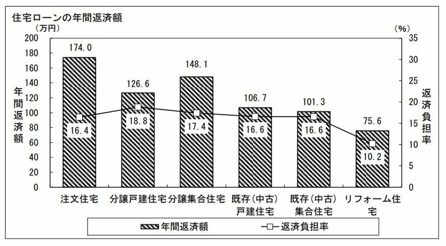 一方で年間返済額は、注文住宅が174万円、分譲戸建住宅が126万6000円、分譲集合住宅が148万1000円です。