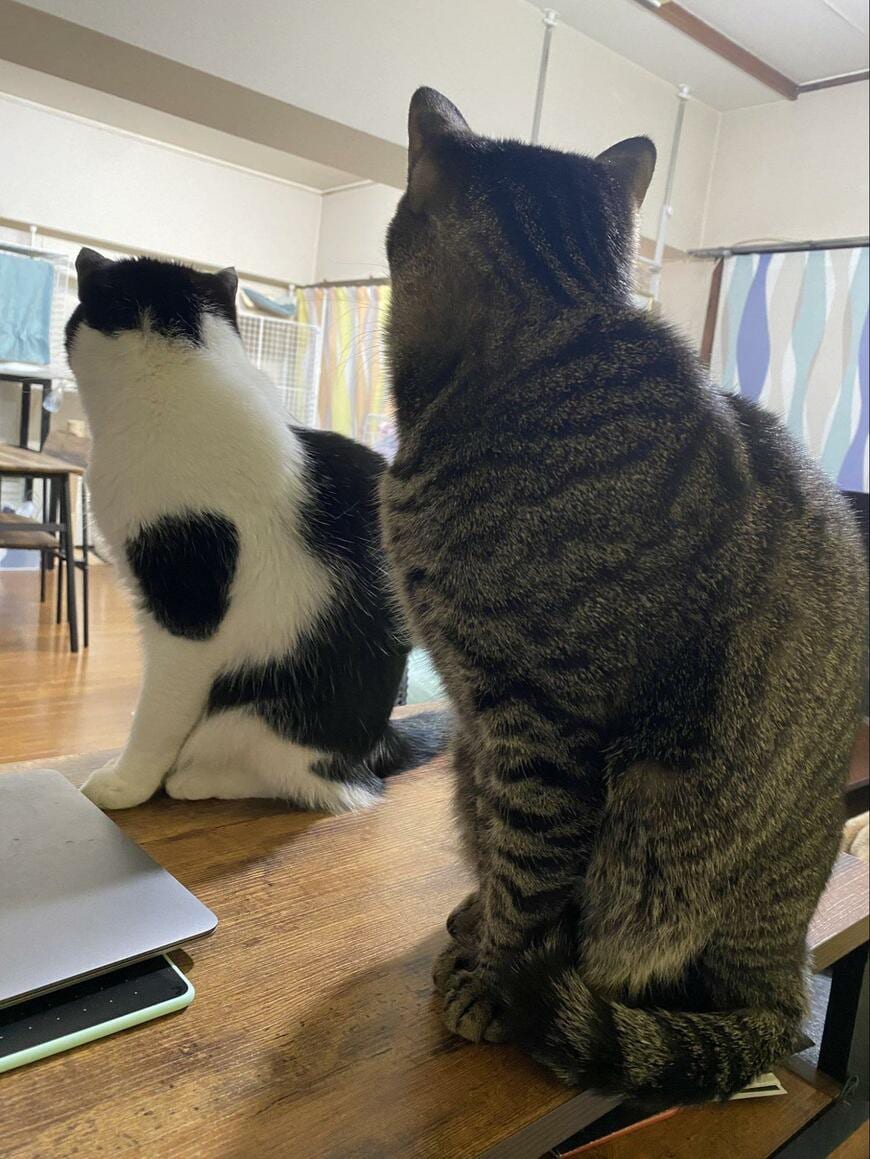 白と黒のハチワレ猫「モズク」ちゃんと、キジトラ猫の「シイタケ」くん。「はい、チーズ」と声を掛けた飼い主さんでしたが、2匹は見事に「プイッ」と反対側を向いています。