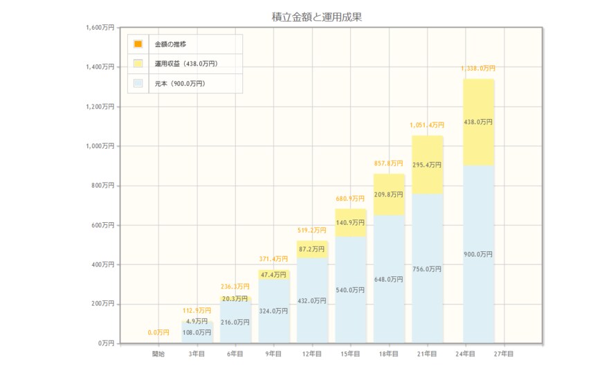- 積立投資(年利3%):約1338万円(うち元本900万円・利益約438万円)