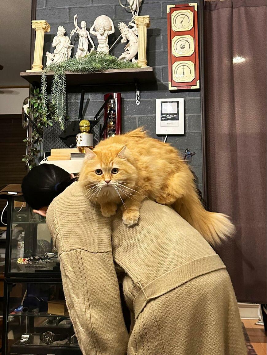 時折、こうして飛び乗ることで愛情を表現することがあるというエマちゃん。大好きなママさんの背中に甘えているのかもしれませんね。