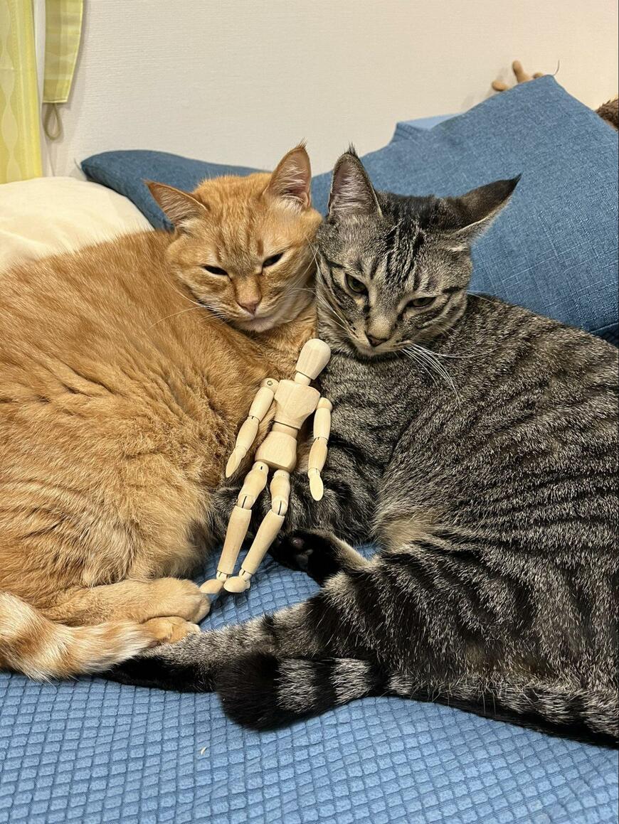 「こうやって猫と寝たい」というコメントとともに投稿されたのは、1枚の写真でした。そこに写っているのは、茶トラ猫のすずくんと、キジトラ猫のつむぎくんです。
