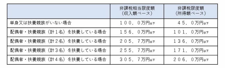 単身世帯もしくは扶養親族がいる場合、住民税非課税世帯となる想定年収の目安を、世帯状況ごとに確認しましょう。
