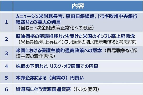 2017年末に112円の半ばであった米ドル/円は、足元では108円台にまで、米ドル安・円高が進展しています。この原因について、私が目にした主要な論説などを抜粋すると図表1のようになります。