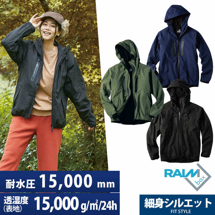 裾には滑り止めが付いているので、冷気や雨が入りにくいというこだわりもあります。あたたかさと防水性を兼ね備えた、冬に一枚は持っておきたいレインジャケット。