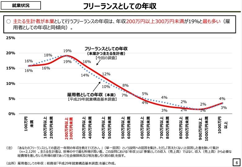 内閣官房日本経済再生総合事務局が2020年5月に発表した調査結果では、フリーランスの年収は、本業かつ主たる生計者である場合に、年収200万円以上300万円未満が19%で最多でした。 雇用者としての年収と同傾向にあります。