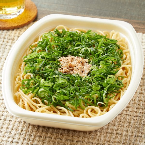 「ガーリックと黒コショウの風味が特徴のスパイシーな塩焼そばです。ごま油和えした青ねぎをたっぷり盛り付け、豚肉とペッパーをトッピングしました。※宮崎県、鹿児島県では取り扱いがございません。」