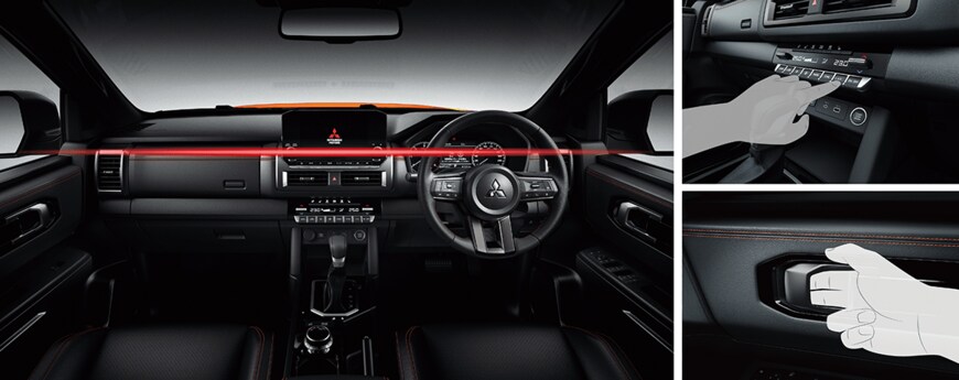 さらにステアリングホイール、グリップ、ドアハンドル類は「MITSUBISHI TOUCH(三菱タッチ)」という考え方に基づき、握り心地や逞しさを追求しています。