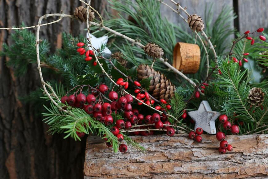 赤い実ものと緑の常緑樹の葉とのコントラストが鮮やかな寄せ植え。