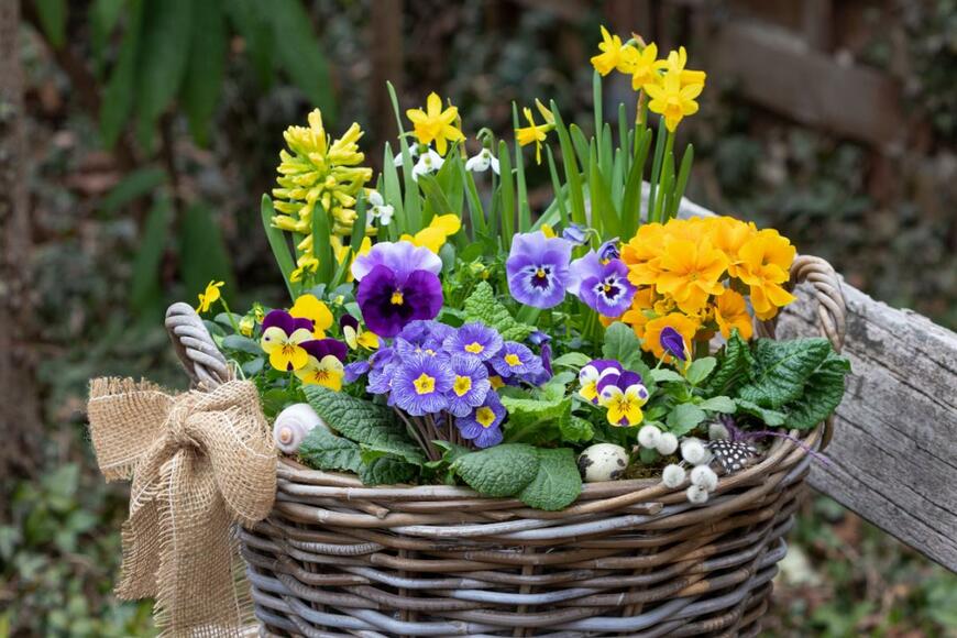 黄色と青(や紫)という反対色を使った寄せ植え。あえて反発し合う色を使うことで、お互いを引き立てる効果を狙っています。