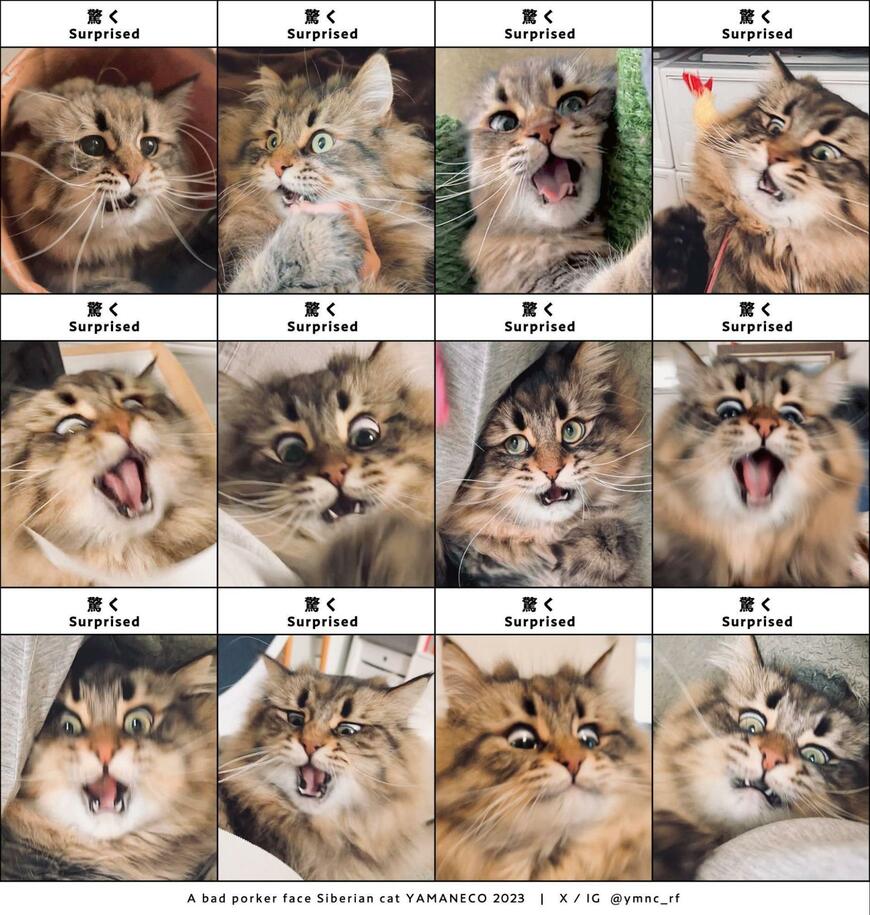 投稿された画像には、ヤマネコくんの「驚き顔」が16種類も写っています。白目を見せる衝撃的な驚き顔や、悲しさが入り混じったような驚き顔……思わず見入ってしまいます。