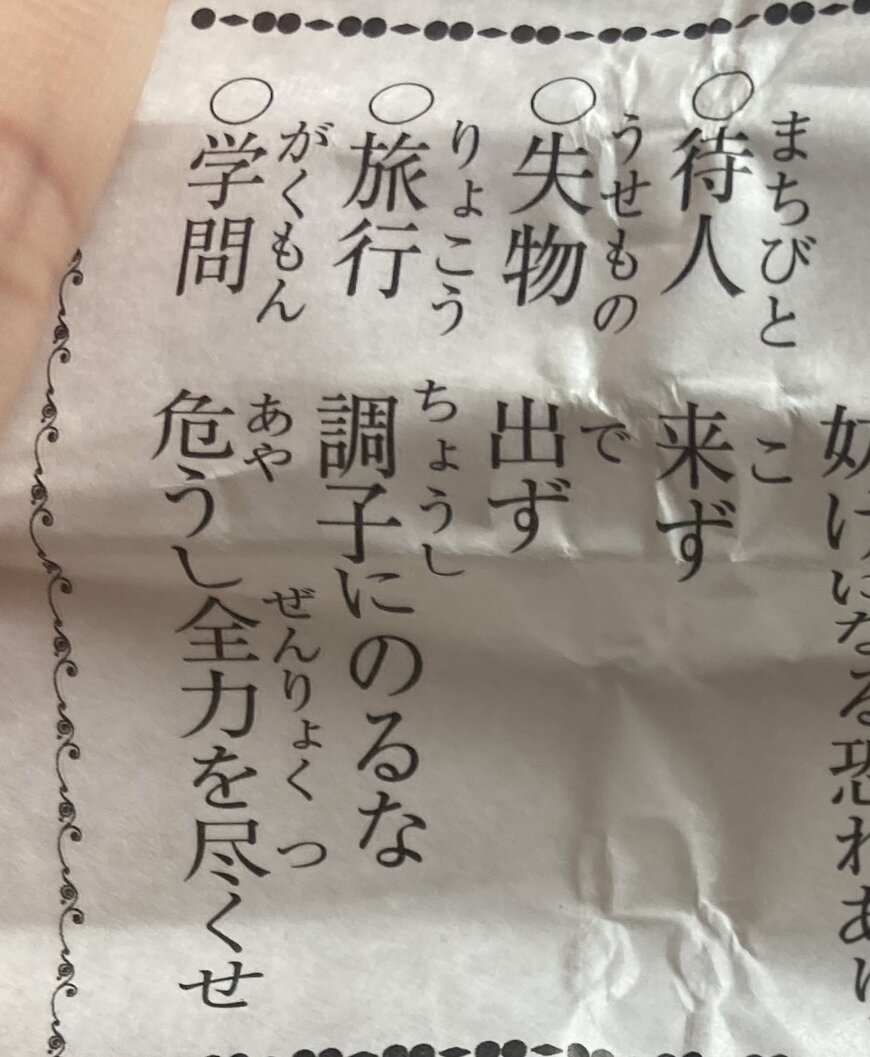 そこに収められていたのは、あまりにも辛辣な内容が書かれたおみくじ。「待人 来ず」「失物 出ず」など端的で厳しい言葉が並んでいますが、とくに辛辣なのは「旅行 調子に乗るな」の一言。