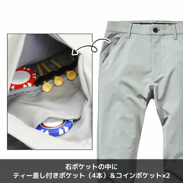 また、吸汗速乾性があるので乾きやすく、サラッとした肌触りが楽しめます。3D立体構造で膝の曲げ伸ばしもラクラク。さらに、ウエストの内側にはインナーが出にくい滑り止め付き。D環にカラビナを付ければ、小物を下げたりもできます。ポケットの中にはティー差しが4本付いているので、探しやすく無くしにくいのもうれしいポイントです。