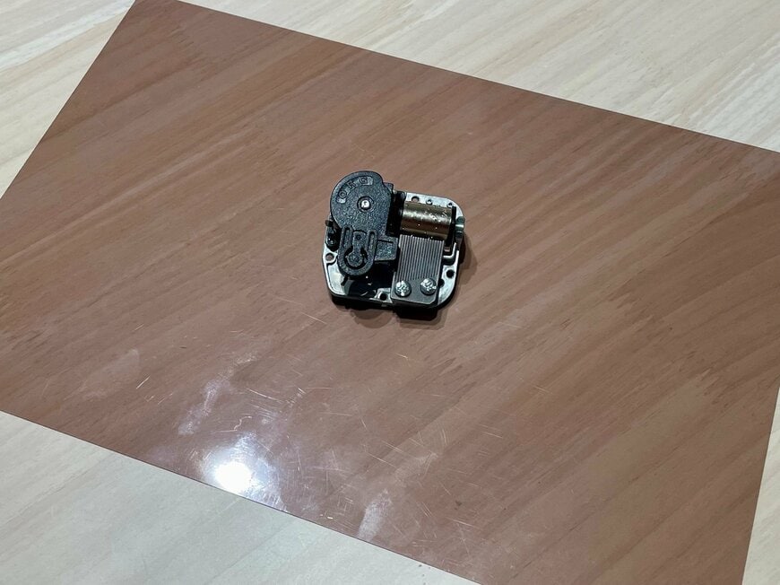 デモキットの中身は下敷きとオルゴール。デモでは下敷きの端にオルゴールを当てて音を鳴らします。下敷きをまっすぐにした状態では、オルゴールの音量は単体で鳴らしたときと変わりません。しかし、下敷きをぐにゃっと湾曲させていくと、一気に音量が増幅されます。