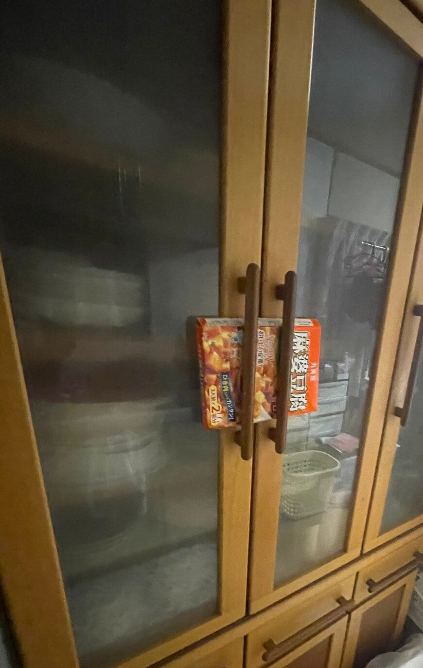 そこに映っているのは、食器棚の取っ手の間に挟まれた「丸美屋の麻婆豆腐」。程良いサイズ感と重みで扉をロックしており、食器が飛び出すのを見事に防いでいます。