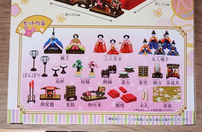 こちらがリーメントから発売されている「今日はたのしいひなまつり」です。価格は、税込7480円(税抜価格6800円)です。完成時サイズは、高さ16cm×横幅10.8cm×奥行12.2cmです。