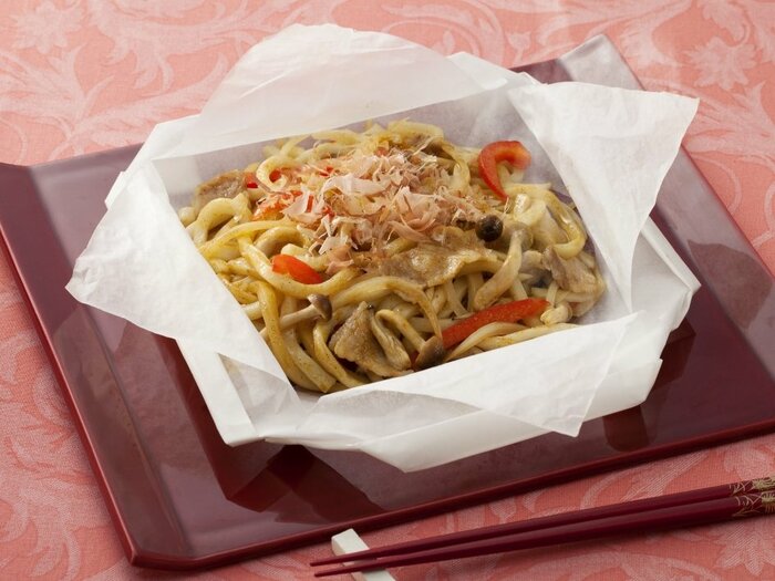 - 「クックパー(R)クッキングシート(L)」を30cm×60cm程度に切り、半分に折ってから耐熱皿に広げ、片側半分の中央にうどんをのせ、水大さじ1(分量外)をまぶしながら軽くほぐす。(1)をのせて合わせたAをまわしかけ、全体をよく混ぜる。