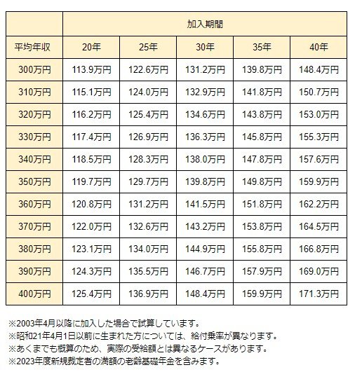 あくまでも目安となりますが、年収と加入期間ごとの年金額をご紹介します。