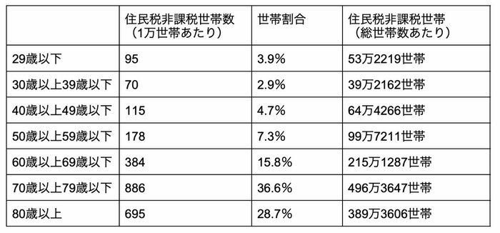 では、住民税が非課税になっている世帯数や年代別の割合を見ていきましょう。