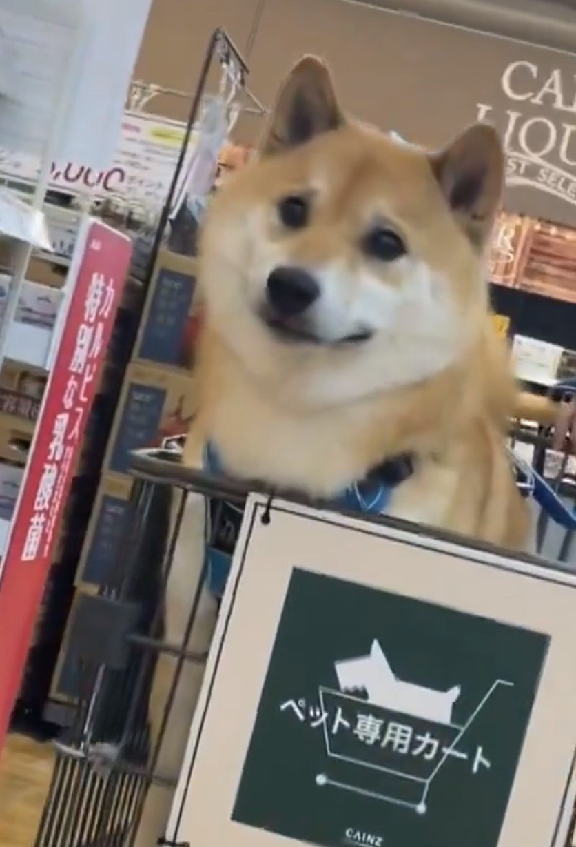 そこに収められていたのは、ホームセンターでペット用カートに乗る柴犬。おやつを買ってもらえる楽しいおでかけのはずが、表情はどこか不安げです。