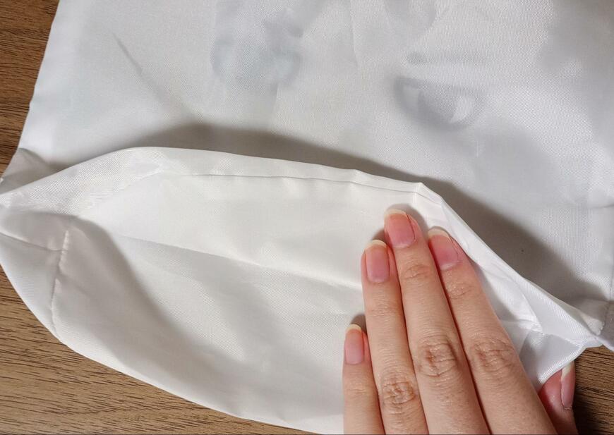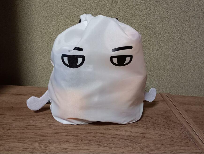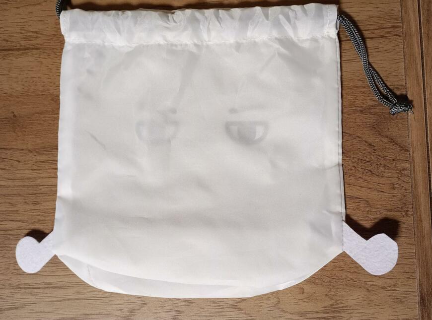 2. ダイソーの「メジェドさま巾着」は、マチ付きです! 透け感はややあるものの使いやすいアイテムです