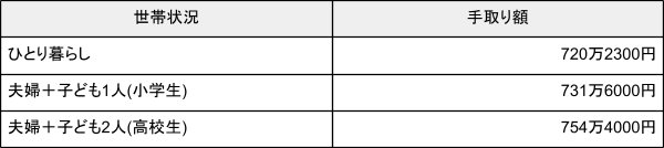夫婦と小学生の子ども1人の世帯の場合、手取り額は約732万円が目安となります。計算方法は以下の通りです。