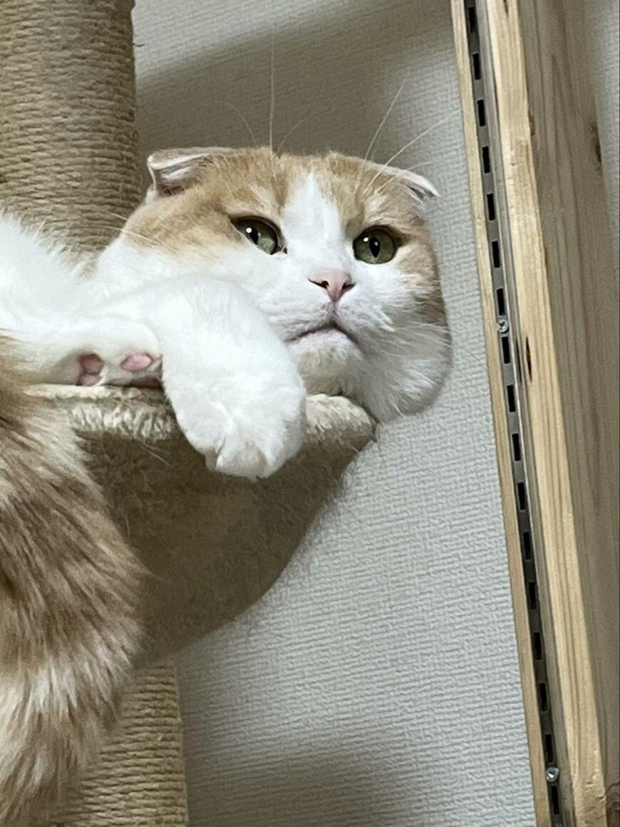 写真のとろくんは、キャットタワーのベッド部分で、身体を丸めくつろいでいる様子。頬をベッドのふちに乗せているようですが、そこからはみ出た白いもふもふは、まるで「お餅」のようです。