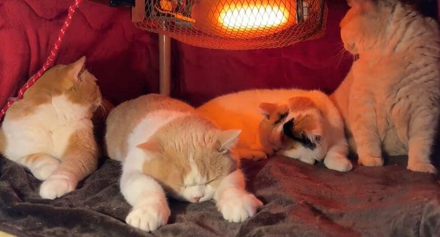ちなみにこちらのこたつは「ほんのりと温かい程度」だそうで、猫ちゃんたちの様子からも居心地のよさが伝わってきます。