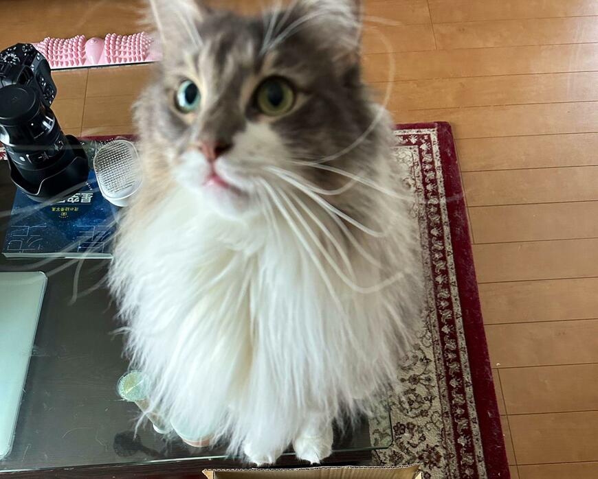 そこに写っているのは二匹の猫ちゃん。手前では「ノーマン」くんが段ボールでスタンバイしており、その上では「レイ」くんがテーブルから視線を送っています。