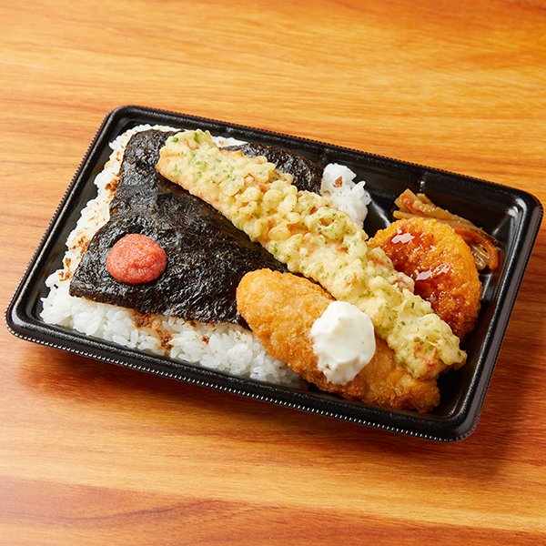 「明太子・白身魚フライ・ちくわ磯辺天・コロッケなどを盛り合わせた海苔弁当です。2週間(1/9(火)~1/22(月))限定でご飯を20%増量しています。※宮崎県、鹿児島県では取り扱いがございません。」