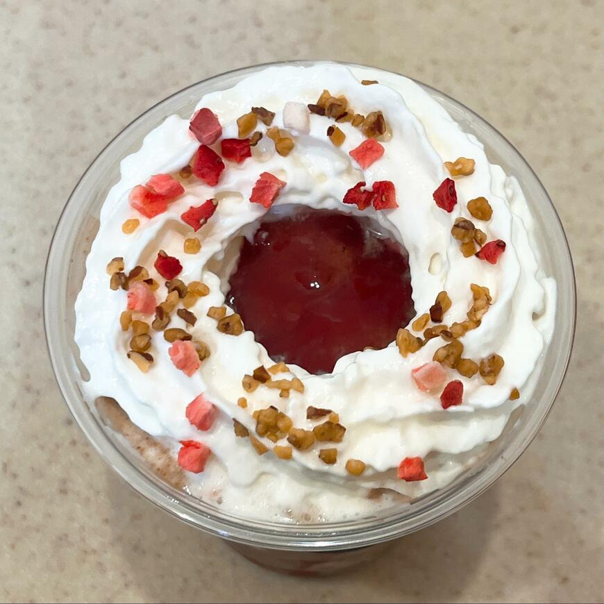 繰り返し歯ごたえを感じさせるジャンドゥーヤと、みずみずしいあまおういちごの甘み。そして、氷粒と合わさったミルクチョコレートベースのリッチなおいしさは、最後まで飽きさせません。ホイップクリームもほんのり甘さやクリーミーさを足してくれますが、全体に上品にまとまっているという印象です。