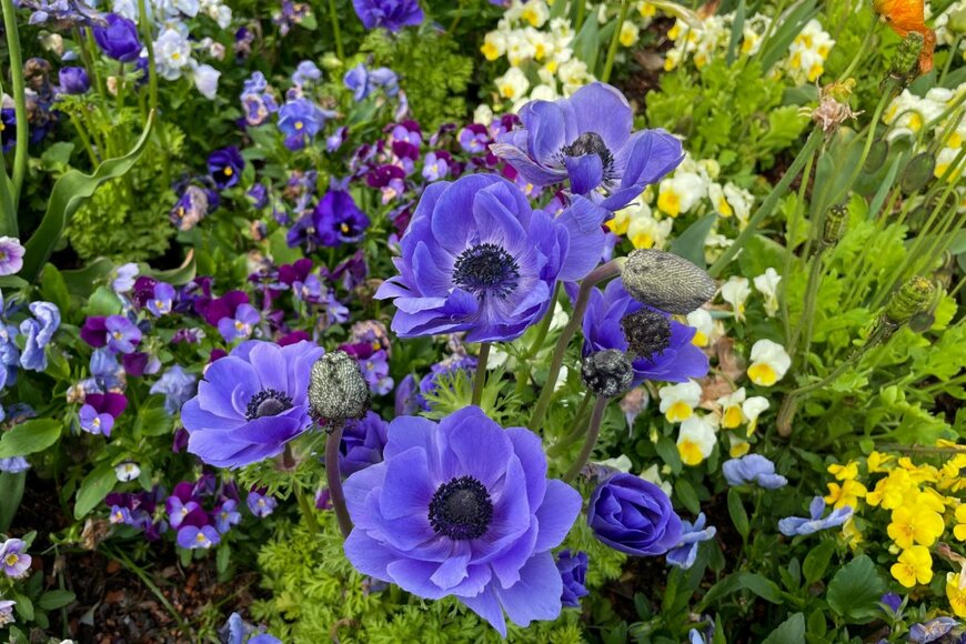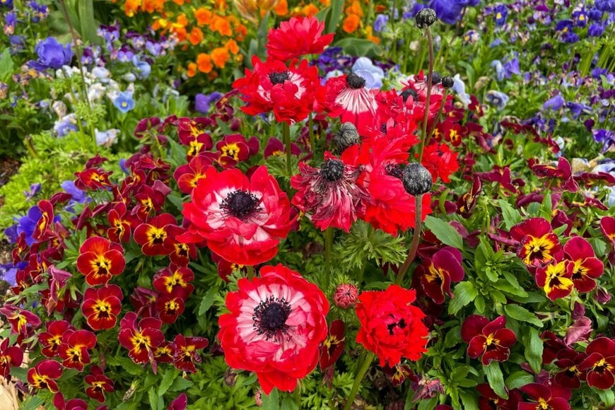 鮮やかな花色がお洒落なアネモネは2月から春まで開花する球根植物。大きな花弁が美しく、足元にフリルのパンジーを植えると華やかな印象になります。