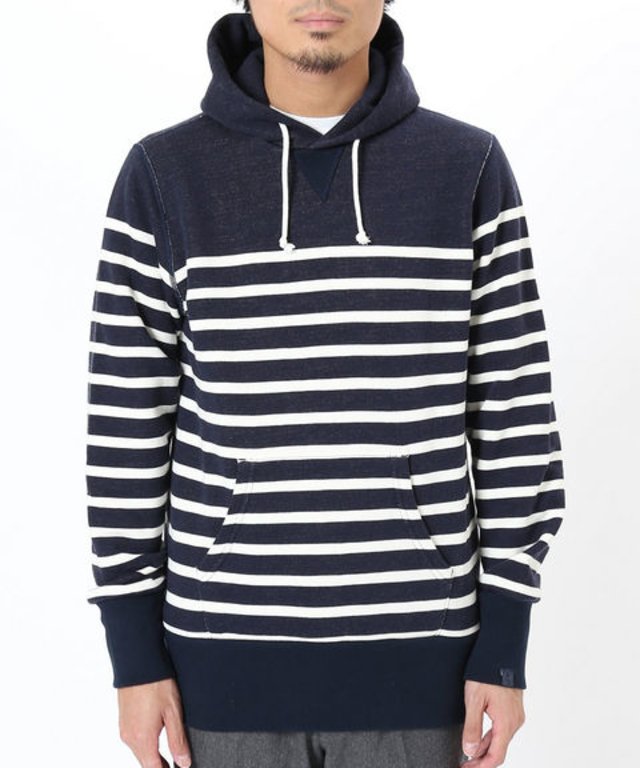 先ほどと同じく、日本の吊り編み機で編まれたウェアを制作する『LOOPWHEELER』のパーカーです。幅広いブランドのコンサルティングを行う『LOWERCACE』とのコラボによって生まれた一枚は、ネイビーのボーダーが目を引くマリンテイストな仕上がり。