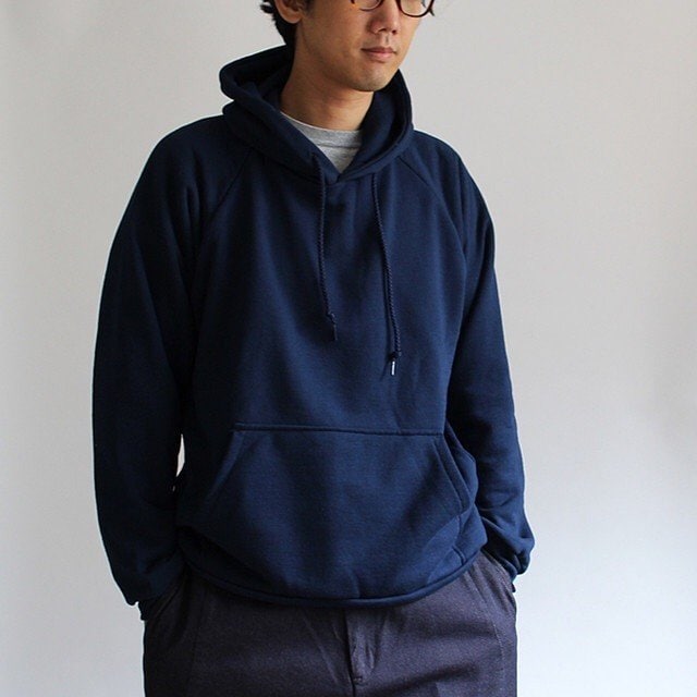 フードはスウェット生地の2枚仕立てで立体感があり、ミニマルなデザインの中にも存在感があります。そして使い勝手がいいネイビーカラー。一つは備えておきたい大定番です。