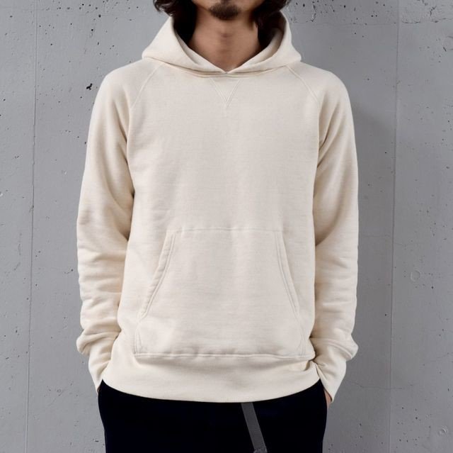使用された素材は大正時代から稼働する「吊り編み機」によってじっくりと編み上げられ、空気をたっぷりと含んだ柔らかな肌触りに。フードはボリューム感が抑えられアーム部分は細めなので、この時期のインナーとして最適です。