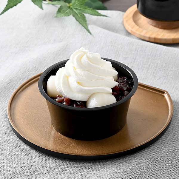 「北海道産小豆使用の粒あんと、北海道生クリームをブレンドしたホイップクリームを重ね、白玉をのせた白玉クリームぜんざいです。」