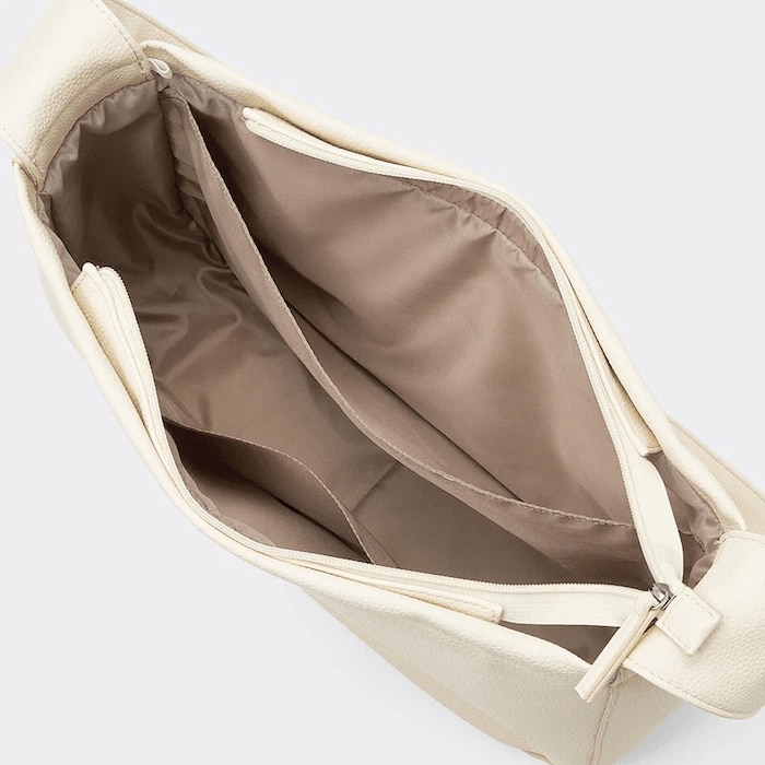 高見えするレザータッチ素材で作られている、大容量のショルダーバッグです。ノートパソコンやA4サイズの書類も楽々入るうえに、内側にポケットが2つあり、収納性もバツグンです。